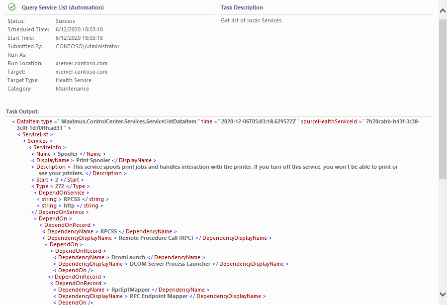 To give you more flavor, the below are outputs from the “Read Event Log Task (Automation)” and “Query Service List (Automation)”. You can compare how the raw XML looks like (not exactly human friendly) versus control tabs view, which is way more structured and more human readable.