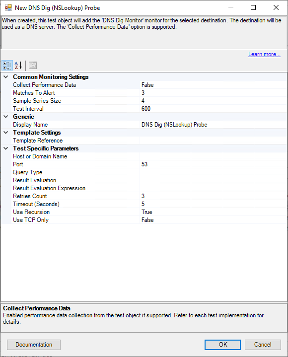 To configure a DNS lookup test, create a new test object of the ‘DNS Dig (NSLookup) Probe’ type. Then configure the following parameters:
